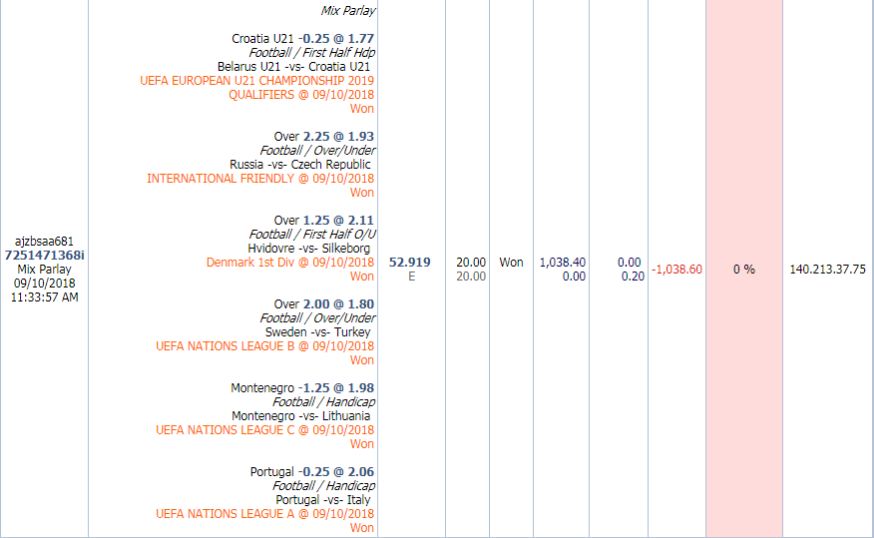 Dari contoh di atas, misalkan Anda bertaruh 20ribu, maka total kemenangan Anda : (1.77 x 1.93 x 2.11 x 1.80 x 1.98 x 2.06) = 52.919 – 1 = 51.919 x modal 20ribu = Rp 1.038.000,-