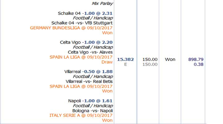 Jika ada taruhan yang berakhir seri, maka taruhan tersebut tidak akan dihitung. Misalkan Anda bertaruh 150ribu, total kemenangan Anda adalah (2.31 x 1.88 x 1.61) x 150ribu = 6.99 – 1 = 5.99 x modal 150ribu = Rp 898.000,-